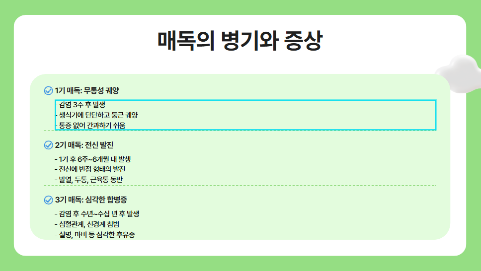 다행히 매독은 초기에 진단을 받아 치료하면 완치율이 높은 편입니다. 페니실린 계열 항생제나 대체 약물로 적절히 대응하면, 전신에 퍼지기 전에 확실히 차단할 수 있습니다. 문제는 1기 또는 2기 매독을 제때 인지하지 못하거나, 잠복기에 접어들어서 오랜 시간 방치되는 경우입니다. 그때는 이미 중추신경계, 심혈관계, 안구 등의 손상이 진행된 뒤가 되어 회복하기 훨씬 까다롭습니다.