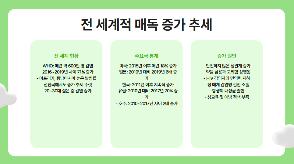 최근 전 세계적으로 ‘매독’이라는 성 매개 감염병이 급증하고 있어 주의가 요구됩니다. 특히 일본과 미국, 그리고 국내에서도 신고 환자 수가 빠르게 증가하는 추세입니다. 통증 없는 초기 궤양 때문에 감기로 착각하기 쉽고, 10년 이상 무증상으로 지내다가 실명이나 중추신경계 손상처럼 심각한 합병증을 겪는 사례도 있습니다. 성관계가 활발해지는 사회 환경 속에서 매독은 더 이상 ‘드문 병’이 아니게 됐습니다. 티스토리를 통해 오늘은 매독의 특징과 진행 단계, 예방 및 조기 치료의 중요성을 다양한 관점에서 살펴보겠습니다.