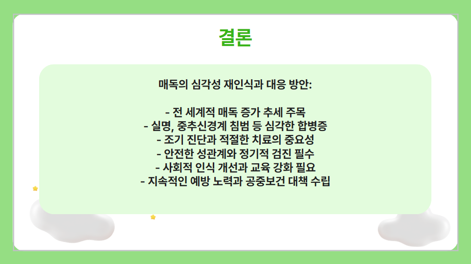 성병, 특히 매독은 한 번 걸리면 몸에 드러나는 증상을 넘어서 정서적·심리적인 스트레스까지 유발합니다. 때로는 연인이나 배우자와의 관계에도 부담이 될 수 있고, 임신을 계획하는 과정에서 심각한 문제로 이어질 수 있습니다. 안전한 성생활 수칙을 지키고, 성병 위험이 있는 환경은 적극 피하거나 조심하는 태도가 중요합니다.