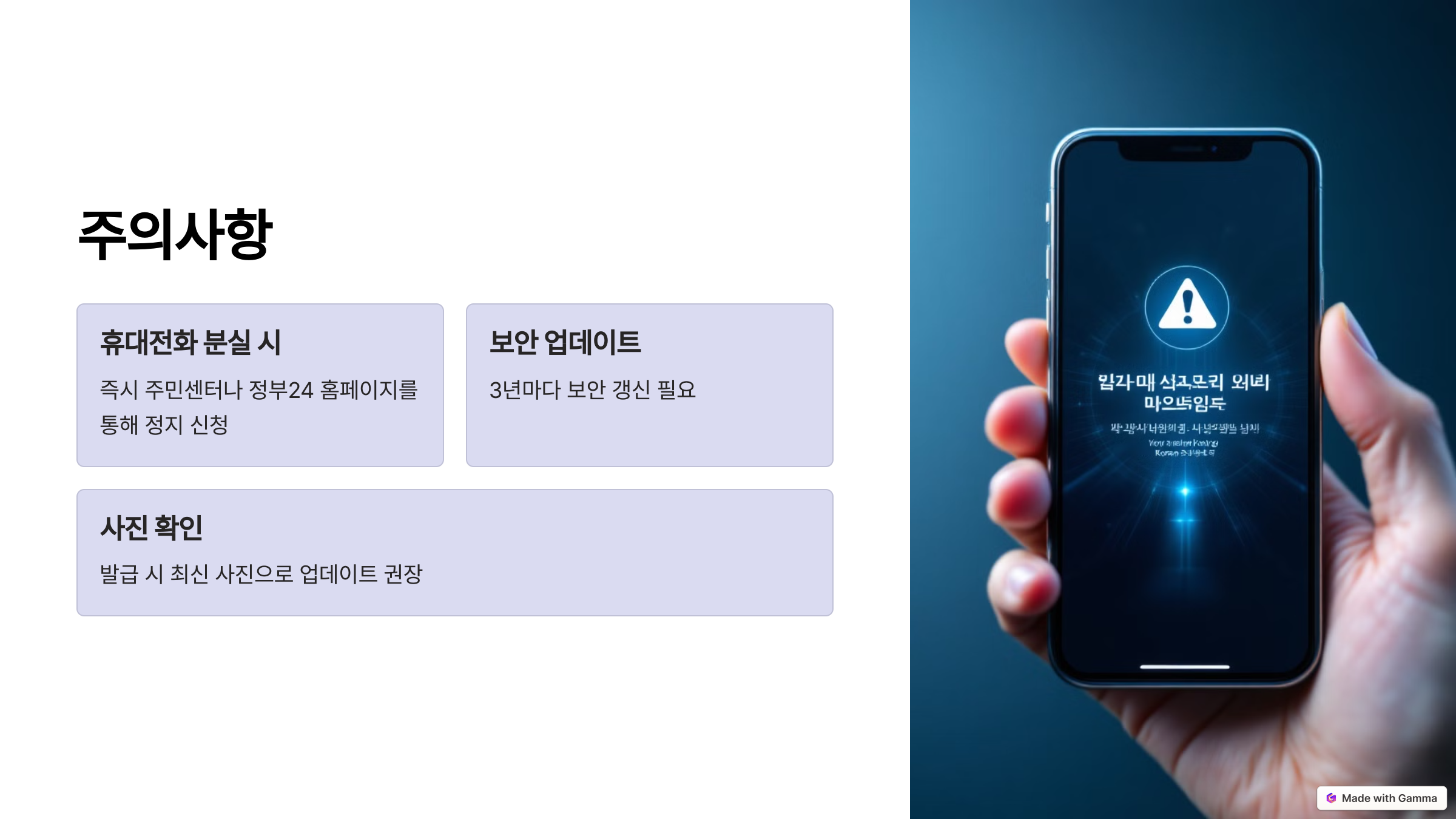 다만, 새 휴대전화로 기기를 변경하거나 앱을 삭제했을 때는 다시 주민센터에 가서 재발급을 받아야 한다는 점이 조금 번거롭습니다. 또한 본인 인증을 위해 실물 주민등록증이 필요하므로, 분실하지 않도록 미리 챙겨가야 합니다.