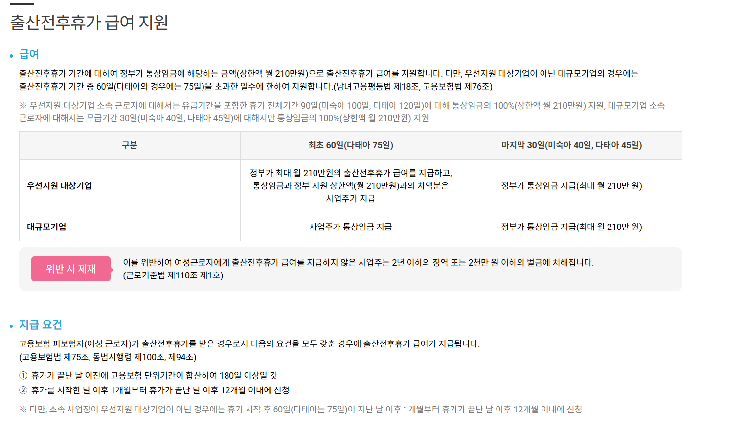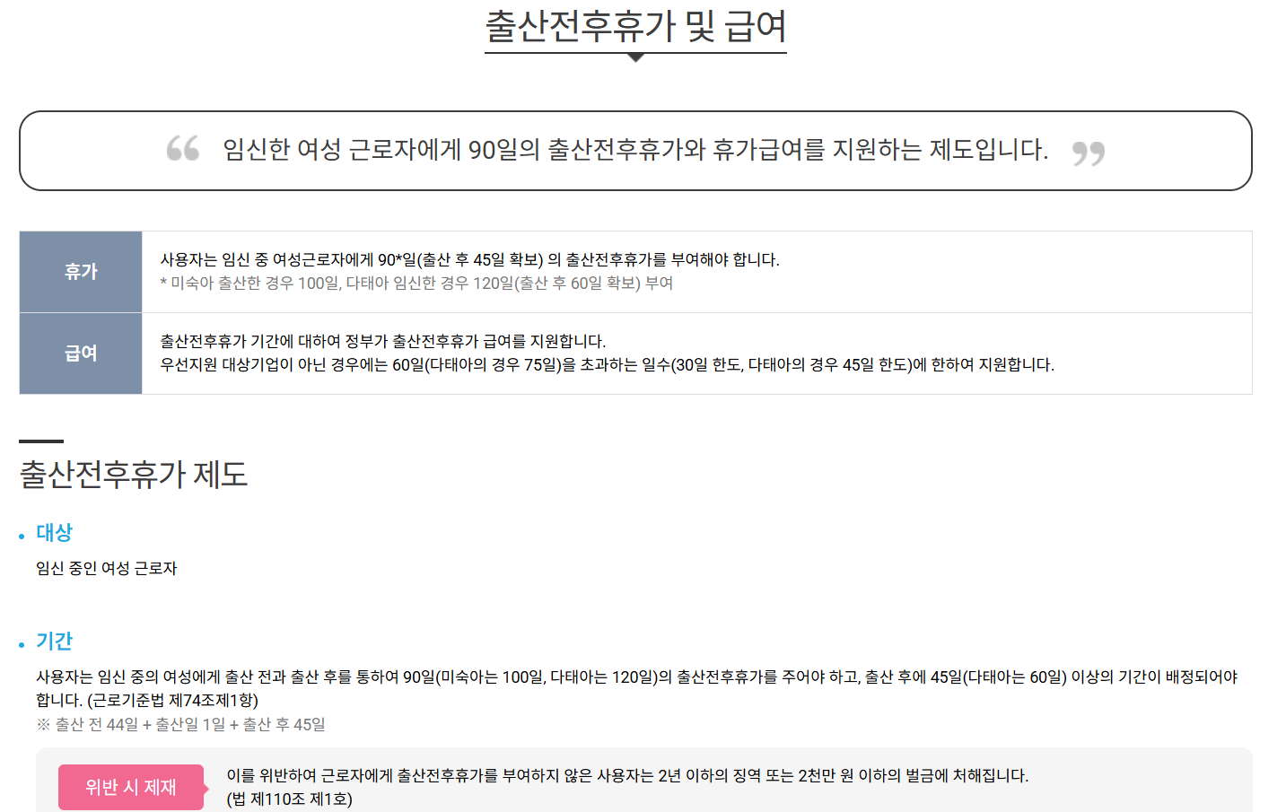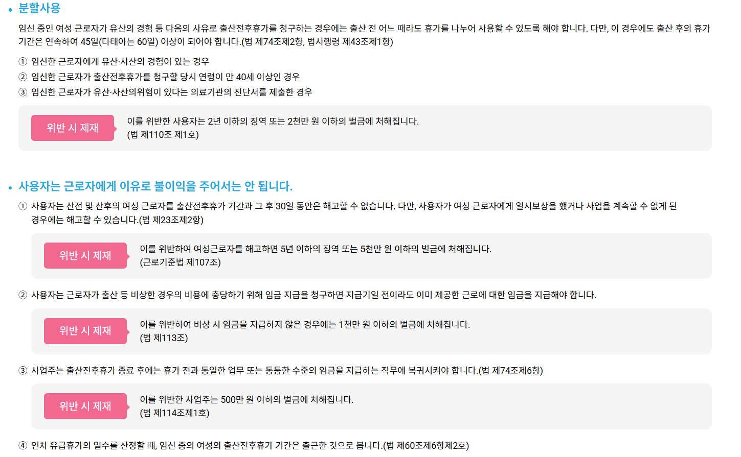 💡 출산전후휴가를 사용하지 못하게 하면 최대 2년 징역 또는 2천만 원 이하 벌금!